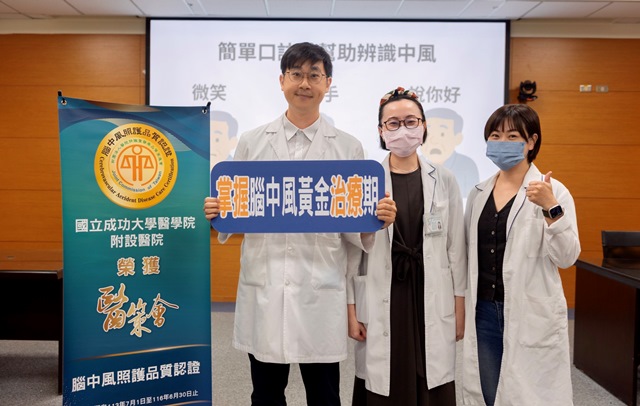 【民正新聞記者:蔡永源,蔡慧茹台南報導】 黃先生是剛退休的國中老師,平時身體健康。在新年後夜間,他突然感到頭暈、說不出話,右手腳也逐漸無力。太太原以為只是感冒疲倦,建議先休息。但她很快想起「微笑、舉手、說你好」的中風辨識口訣,請先生試著配合動作,發現他完全無法完成,立刻撥打119求助。救護人員到場後高度懷疑為腦中風,立即送黃先生至附近的中風急救責任醫院,施打靜脈血栓溶解劑,再經急性中風轉診系統轉送至成大醫院。成大醫院中風團隊迅速啟動顱內動脈取栓術,從抵達醫院至打通血管約90分鐘。黃先生的語言與肢體功能恢復良好,經過照護與復健,半年後已能自理生活,也能與家人一同出國旅遊。他回想,若不是及時就醫,未來的日子可能只能臥床度過。