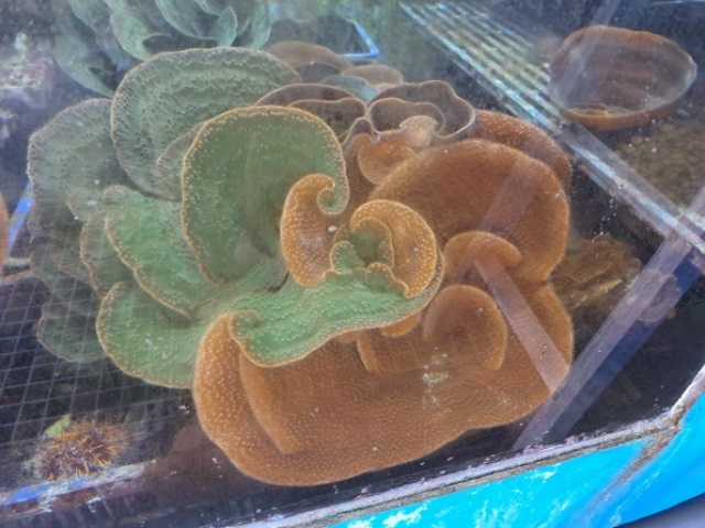 此次展出的膜形盤珊瑚屬於石珊瑚類群,擁有堅硬碳酸鈣骨骼,外型呈葉狀、盔狀或杯狀,表面佈滿微凸的珊瑚孔,能同時藉由捕食浮游生物與共生藻進行營養攝取。這株珊瑚特別之處在於其罕見的雙色外觀,綠色與棕色交融的色澤,與多數僅呈現單一色澤的珊瑚相比顯得尤為珍貴與吸睛。