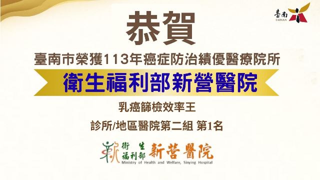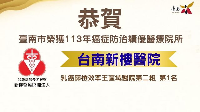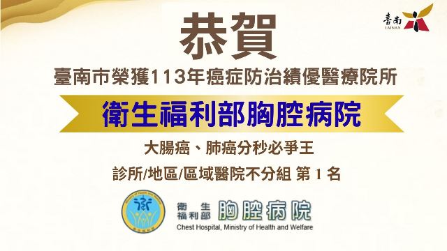 台南新樓醫院則在乳癌篩檢效率上的卓越表現,榮獲「乳癌篩檢效率王」;衛生福利部新營醫院在地區醫院組中,以優秀的乳癌篩檢效率榮獲「乳癌篩檢效率王」第一名;衛生福利部胸腔病院則在地區醫院組中,榮獲「大腸癌及肺癌分秒必爭王」,以表現出色的癌症陽性個案追蹤成績獲得肯定。