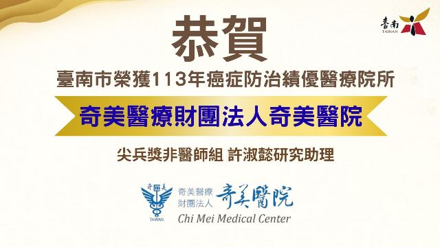 個人組部分,奇美醫院的許淑懿研究助理因在癌症防治工作中的突出貢獻榮獲「防癌尖兵獎」,其不遺餘力的付出獲得了高度肯定。