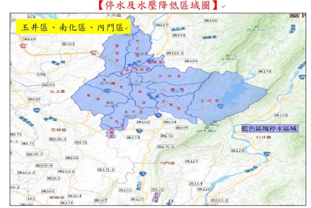 本次因停水施工,用戶用水壓力影響區域為:台南市永康區、安平區、東區、中西區、北區、玉井區、南化區、安定區、新化區、左鎮區、善化區、大內區、山上區、新市區、歸仁區、關廟區、龍崎區、仁德區,影響戶數共計321,919戶(停水戶數243,216戶,水壓降低戶數78,703戶),除停水及水壓降低區域外,其餘地區可正常供水。復水初期水質可能較為混濁,請用戶暫勿取用,俟水清後再進水。