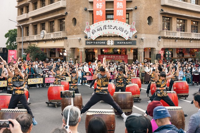 末廣町沿線兩側擠滿前來共襄盛舉的民眾,許多民眾配戴今年活動限定的撞色領巾、揮舞手拿旗,隨遊行隊伍前進合照、與表演者熱情互動;孩子模仿動作、旅客在街角錄影紀錄的畫面隨處可見,整段遊行不僅是單向觀看,而是充滿參與感的街道嘉年華。隊伍抵達林百貨後,由虎山實小鼓術擊樂團以磅礡鼓聲揭開後半段節目序幕,緊接著統一7-ELEVEN獅啦啦隊 UniGirls 接力登場,六名成員以熱力舞蹈與應援帶動全場氣氛,並為林百貨獻上祝福,主舞台再次湧入大批民眾,將現場熱度推向再一次高點。