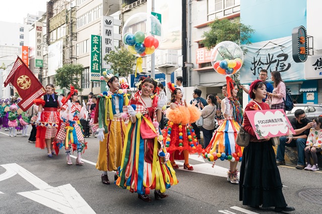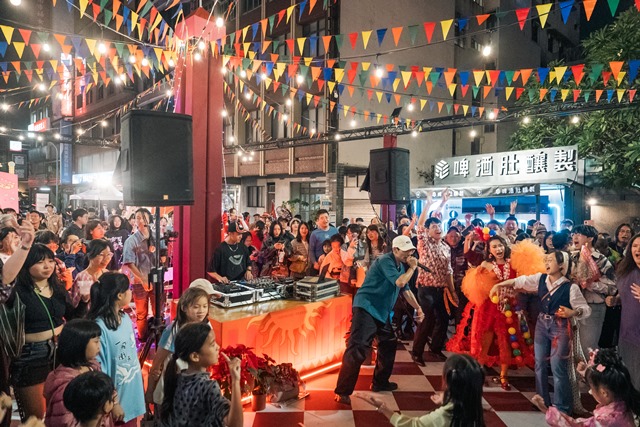 今年活動開場,最吸睛的亮點為林百貨攜手艸非火 Fake Fire Atelier 推出的「繽紛旗海共創計畫」裝置藝術。事前向市民與旅客募集近千則手寫祝福,並轉化為一面面獨一無二的旗幟創作,由林百貨旗隊於遊行開場高舉入場,象徵城市祝福隨著旗海在街道間流動綻放。忠義路舞台區則以嘉年華概念貫穿整體視覺設計,從格紋地板、懷舊座椅到休憩區,處處呼應本次主視覺;街道兩側佈置多組大型拍照背板與互動框景,吸引民眾駐足取景、留下專屬回憶。現場更集結三組街頭藝術表演者、三種復古經典遊戲及十一家人氣美食市集接力登場,讓古蹟街道搖身一變,成為融合藝術與生活的城市文化舞台。