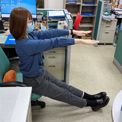 - 向右轉腰並且頭向後轉,將雙手扶於椅背協助(盡量即可)