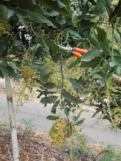 芒果畸形病俗稱「瘋花」或「瘋欉」,受感染的花穗不易著果,也有人稱之為「公花」。罹病花穗出現花軸變短、簇生,嚴重時其體積可達正常花穗的2倍大,幾乎不著果也不正常謝花,於盛花期至幼果期易於田間發現。建議在疏果修剪枝條時,剪除畸形花穗及枝葉,由病徵處再往上多剪除約45~60公分(約一尺半到二尺),剪下的罹病組織需移出園區,避免病原菌再度隨風雨傳播。臺南農改場建議於花期選擇輪流使用以下登記藥劑防治,如25.9%得克利水基乳劑及50%免賴得可濕性粉劑,同時抑制炭疽病、蒂腐病及白粉病的發生蔓延,若田間有畸形病發生,可於疏果修剪後利用上述藥劑一起進行防治。
