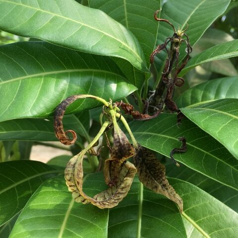 炭疽病和蒂腐病可危害花穗、嫩葉、嫩枝及果實,於開花期至貯藏期皆可發生。新抽出的幼嫩葉片極易受侵染,病葉與病果為炭疽病主要的感染源。藥劑防治應從芒果秋梢開始,防止新梢受病原菌感染,雨後需加強防治。白粉病好發於花期,以花穗及幼果果柄為主要感染部位,幼葉亦會受感染,於初春乍暖還寒時發病嚴重,偶爾降雨促進病害快速蔓延。病原菌孢子主要藉風傳播,訪花昆蟲亦可攜帶蔓延。建議於開花或發病初期開始施藥2-3次,至幼果期為止。