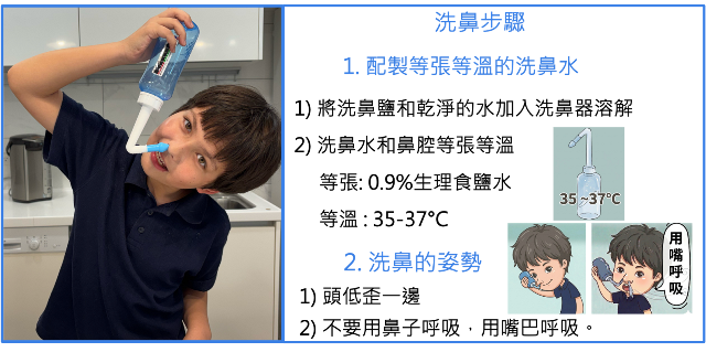 洗鼻子是一種安全、簡單且可行的方法,能有效改善過敏性鼻炎、非過敏性鼻炎、感冒與鼻竇炎。原理是用大量的洗鼻水,將鼻腔中的髒東西如過敏原、刺激物、污染物、病菌及發炎物質(圖一)沖洗乾淨,自然可減少後續的過敏發炎反應。