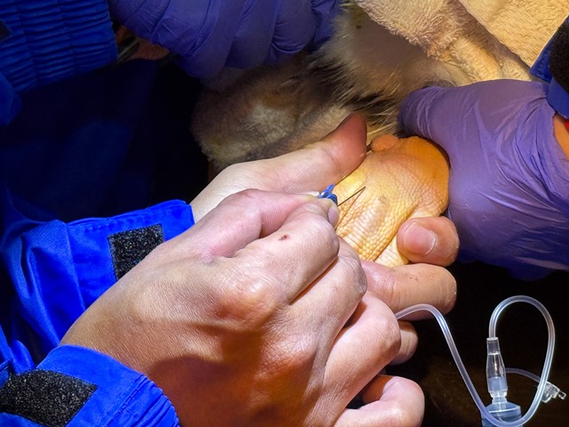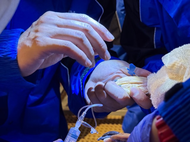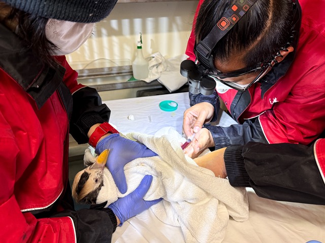 海生館每年定期為館內企鵝進行完整健康檢查,項目涵蓋體重與體態監測,以及血液檢驗分析,並由國立屏東科技大學獸醫系專業醫療團隊協助執行,確保數據精準、判斷嚴謹。值得一提的是,抽血前,飼育員會先讓企鵝泡溫水,讓血管可以在皮膚表層更浮出一點,方便獸醫找到合適的下針位置,既是醫療標準程序,也讓整個檢查過程多了幾分暖心與逗趣。