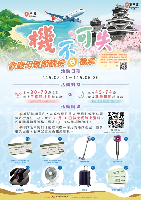 衛生局榮獲114年衛生福利部保健業務優等、防疫業務優等、口腔業務第一名等十幾項大獎,顯見衛生局照護市民健康的用心,健康是給家人最好的禮物,本次衛生局活動誠意十足,特別規劃臺南直飛日本熊本或沖繩的雙人來回機票作為大獎。此外,獎項包含登機箱、吹風機、吸塵器、足部按摩機、循環扇及 200 元超商禮券等多項實用好禮。期望透過豐富獎項,鼓勵女性市民落實定期篩檢,在愛家人的同時,更要愛自己。